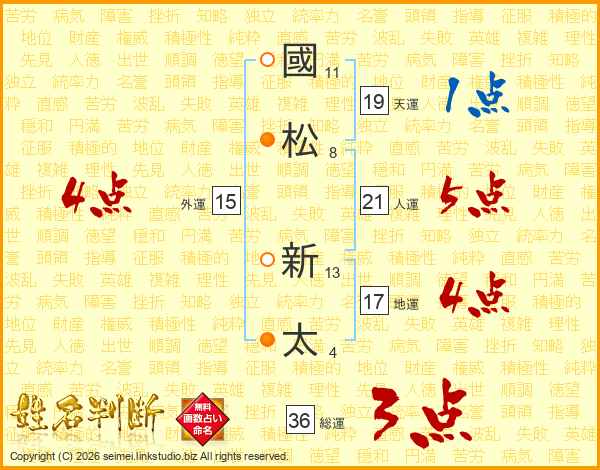 あなたの人生を表す1番重要な運勢です。生涯を通じて影響する総合運となり、主に50歳以降の晩年期に影響を及ぼします。苗字と名前の合計画数。