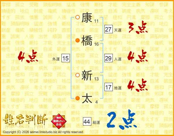 康橋新太さんの総運は44画の2点!
