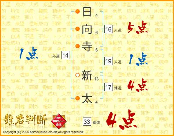 日(4画)向(6画)寺(6画) 新(13画)太(4画)