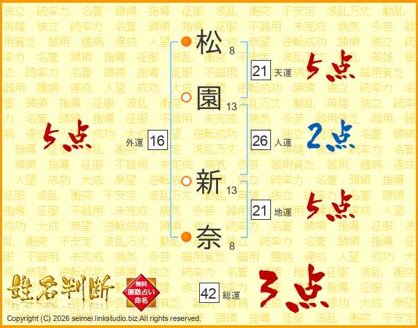 松(8画)園(13画) 新(13画)奈(8画)