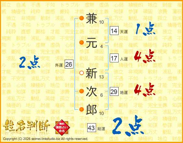 兼(10画)元(4画) 新(13画)次(6画)郎(10画)