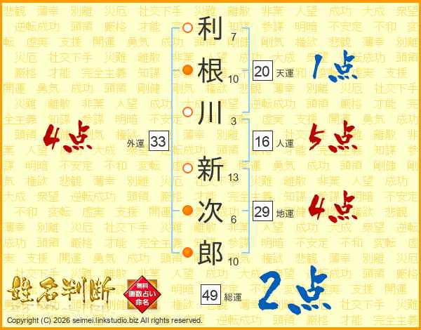 利(7画)根(10画)川(3画) 新(13画)次(6画)郎(10画)