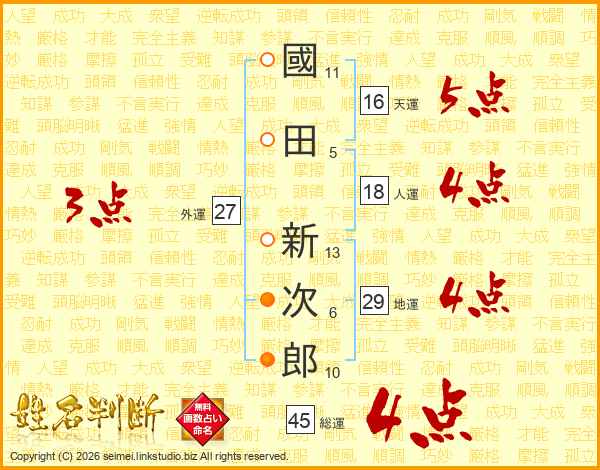 國(11画)田(5画) 新(13画)次(6画)郎(10画)
