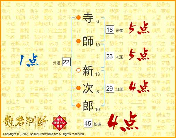 寺(6画)師(10画) 新(13画)次(6画)郎(10画)