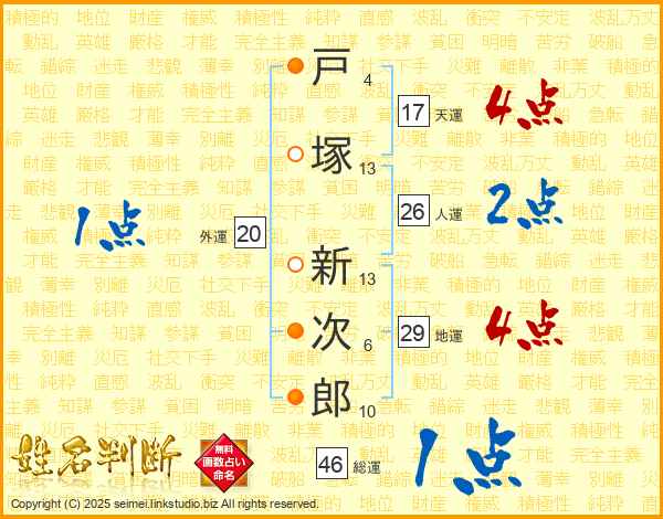 戸(4画)塚(13画) 新(13画)次(6画)郎(10画)