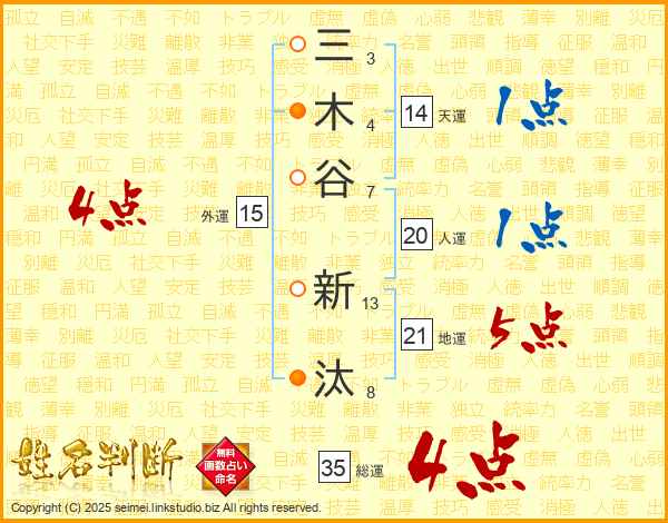 三(3画)木(4画)谷(7画) 新(13画)汰(8画)