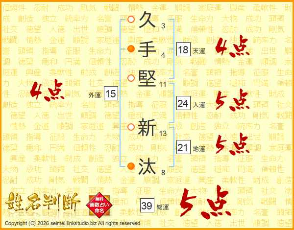久手堅新汰さんの総運は39画の5点!