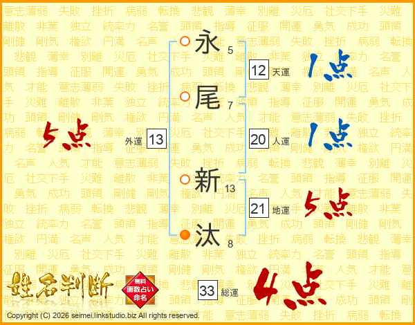 永(5画)尾(7画) 新(13画)汰(8画)