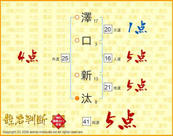 生活面を象徴する運勢です。外部から受ける影響力を表し、結婚運、家庭運や職場、環境への順応性を表します。総運から人運を引いた画数。姓や名が1文字の場合を除く。