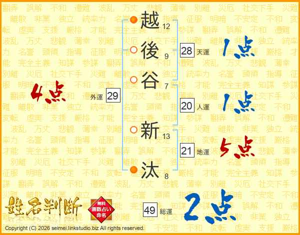 越(12画)後(9画)谷(7画) 新(13画)汰(8画)