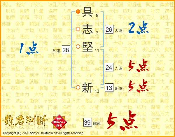 あなたの人生を表す1番重要な運勢です。生涯を通じて影響する総合運となり、主に50歳以降の晩年期に影響を及ぼします。苗字と名前の合計画数。
