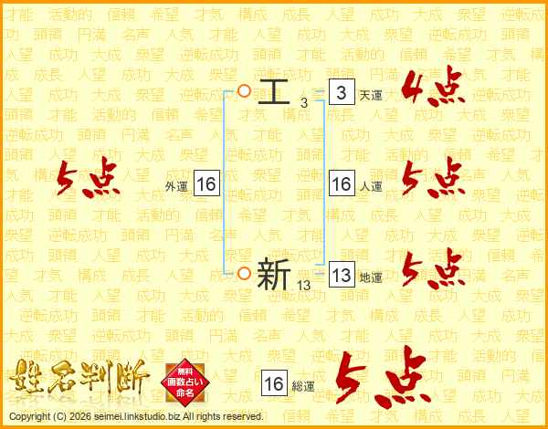 生活面を象徴する運勢です。外部から受ける影響力を表し、結婚運、家庭運や職場、環境への順応性を表します。総運から人運を引いた画数。姓や名が1文字の場合を除く。