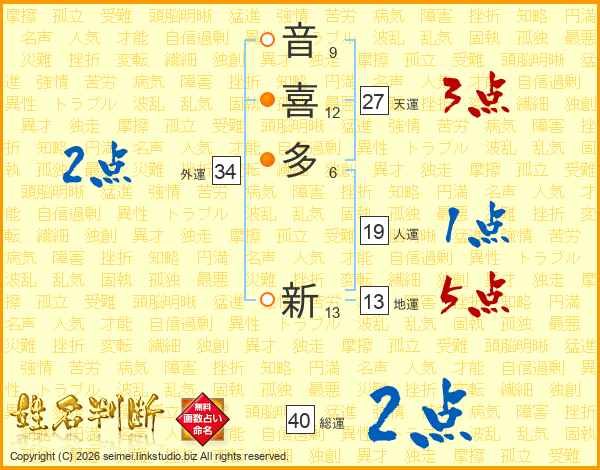 画数の奇数(○陽)と偶数(●陰)の配列で吉凶を占います。どちらかにかたよる名前は大凶名で避ける必要があります。画数の奇数偶数。