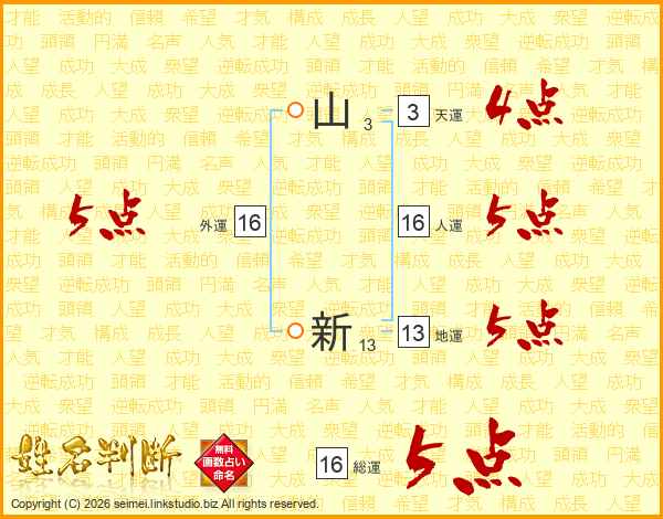 生活面を象徴する運勢です。外部から受ける影響力を表し、結婚運、家庭運や職場、環境への順応性を表します。総運から人運を引いた画数。姓や名が1文字の場合を除く。