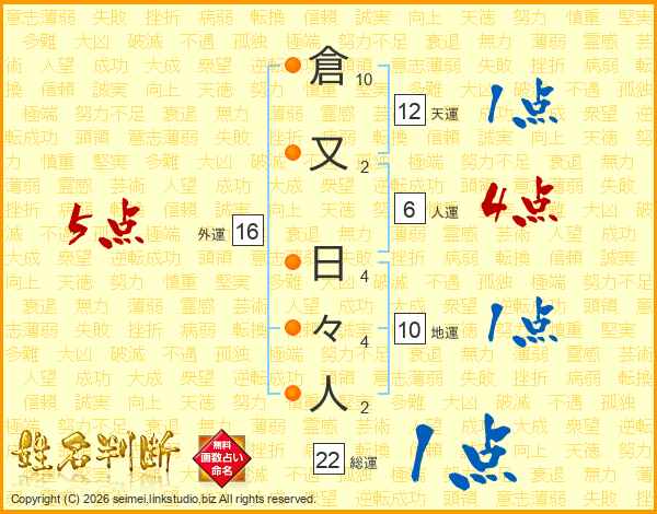 倉又日々人さんの総運は22画の1点!