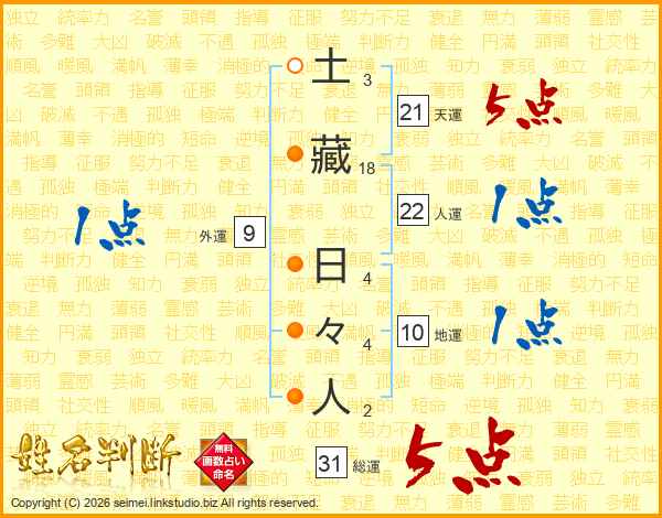 土藏日々人さんの総運は31画の5点!