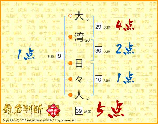 大湾日々人さんの総運は39画の5点!