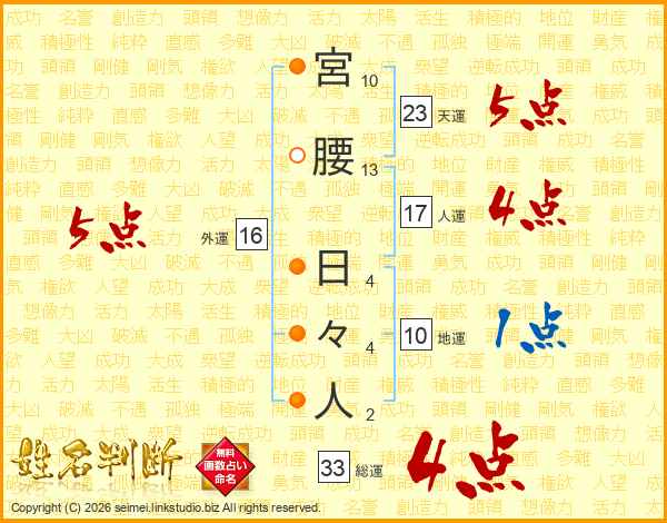 宮腰日々人さんの総運は33画の4点!