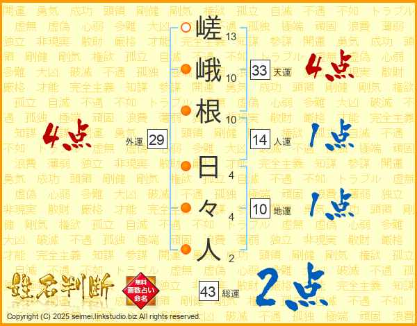 嵯(13画)峨(10画)根(10画) 日(4画)々(4画)人(2画)