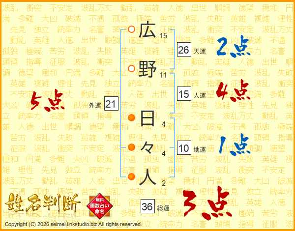 生活面を象徴する運勢です。外部から受ける影響力を表し、結婚運、家庭運や職場、環境への順応性を表します。総運から人運を引いた画数。姓や名が1文字の場合を除く。