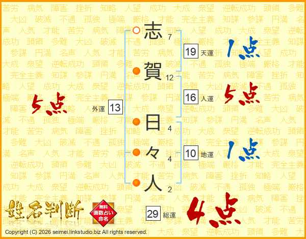 志(7画)賀(12画) 日(4画)々(4画)人(2画)