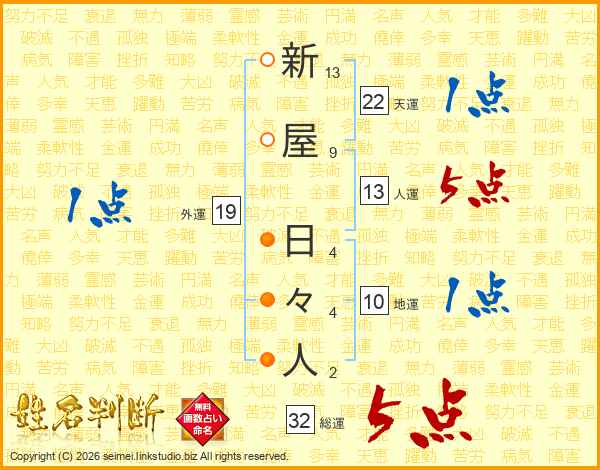 新屋日々人さんの総運は32画の5点!