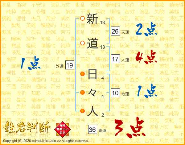 新(13画)道(13画) 日(4画)々(4画)人(2画)