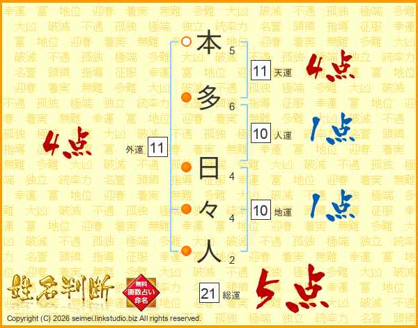 本多日々人さんの総運は21画の5点!