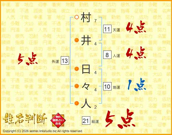 村井日々人さんの総運は21画の5点!