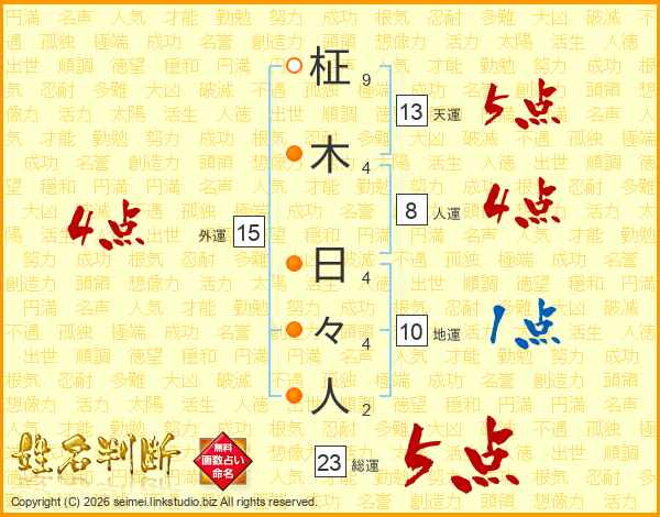柾(9画)木(4画) 日(4画)々(4画)人(2画)