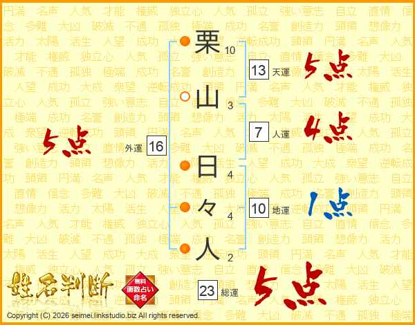 栗(10画)山(3画) 日(4画)々(4画)人(2画)