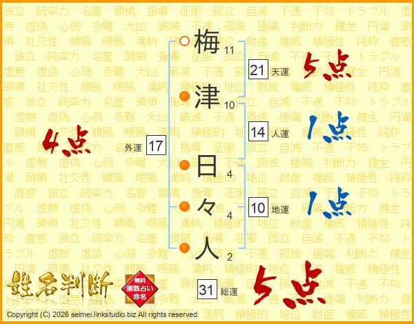 梅(11画)津(10画) 日(4画)々(4画)人(2画)