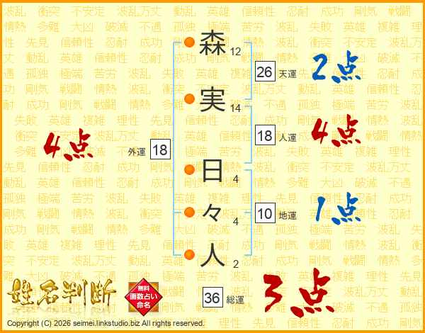 森(12画)実(14画) 日(4画)々(4画)人(2画)