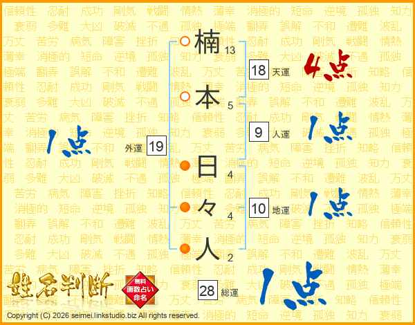 楠(13画)本(5画) 日(4画)々(4画)人(2画)