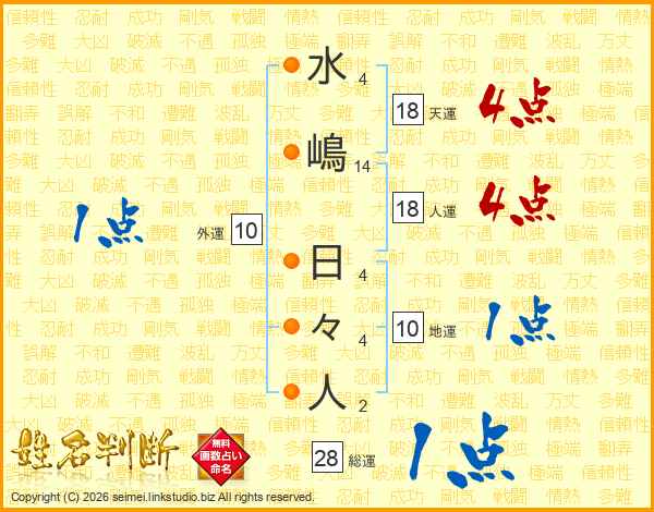 水(4画)嶋(14画) 日(4画)々(4画)人(2画)