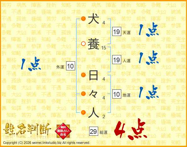 犬(4画)養(15画) 日(4画)々(4画)人(2画)