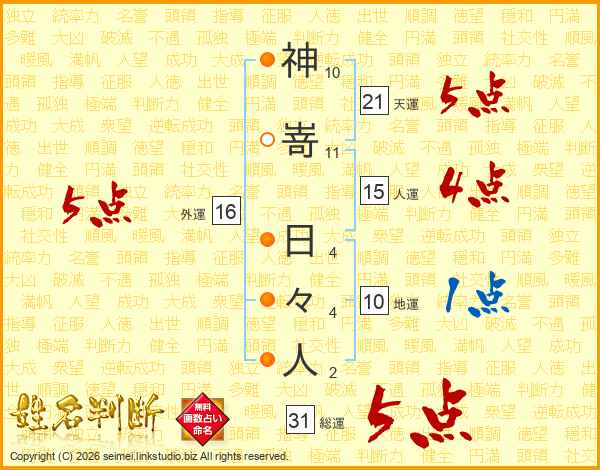 神嵜日々人さんの総運は31画の5点!