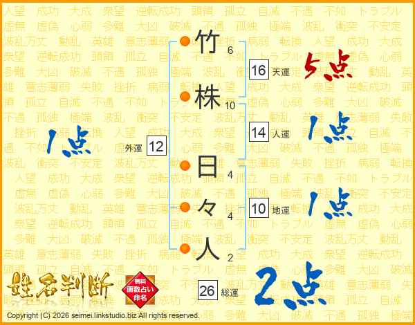 生活面を象徴する運勢です。外部から受ける影響力を表し、結婚運、家庭運や職場、環境への順応性を表します。総運から人運を引いた画数。姓や名が1文字の場合を除く。