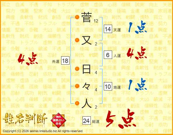 菅(12画)又(2画) 日(4画)々(4画)人(2画)