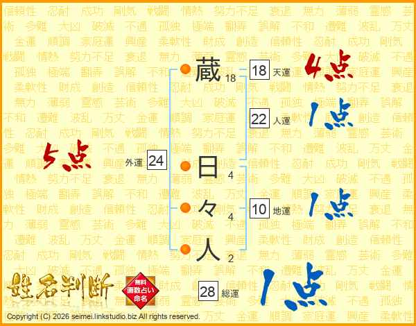 生活面を象徴する運勢です。外部から受ける影響力を表し、結婚運、家庭運や職場、環境への順応性を表します。総運から人運を引いた画数。姓や名が1文字の場合を除く。