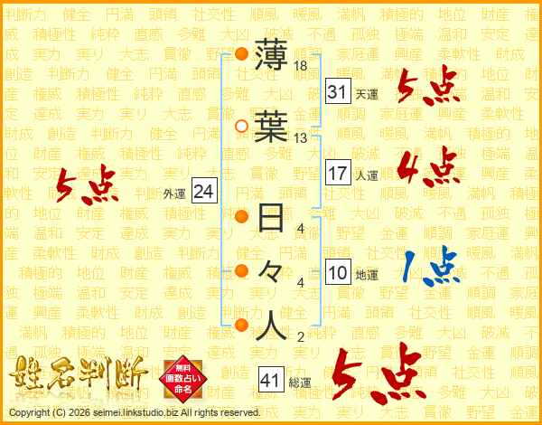 薄葉日々人さんの総運は41画の5点!