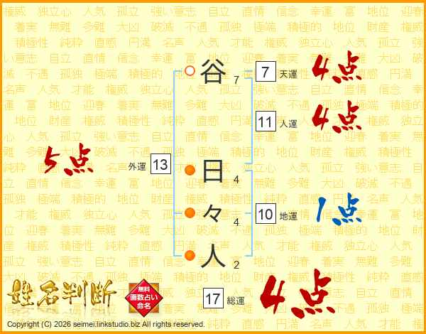 生活面を象徴する運勢です。外部から受ける影響力を表し、結婚運、家庭運や職場、環境への順応性を表します。総運から人運を引いた画数。姓や名が1文字の場合を除く。
