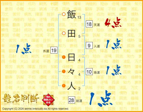 飯(13画)田(5画) 日(4画)々(4画)人(2画)