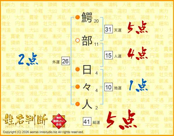 鰐部日々人さんの総運は41画の5点!