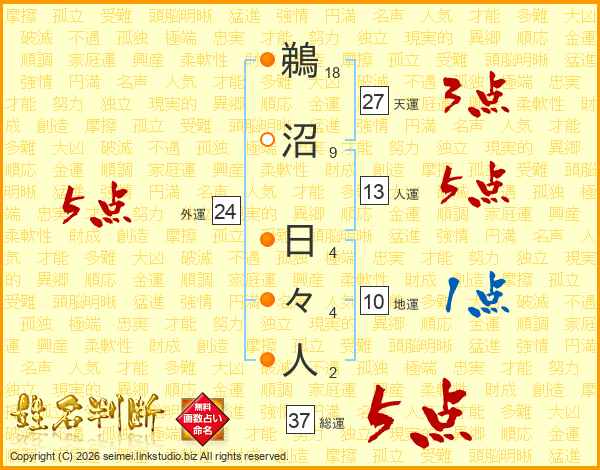鵜沼日々人さんの総運は37画の5点!