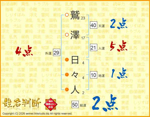鷲(23画)澤(17画) 日(4画)々(4画)人(2画)
