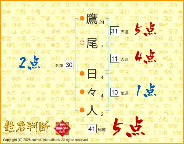 鷹(24画)尾(7画) 日(4画)々(4画)人(2画)