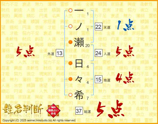 一(1画)ノ(1画)瀬(20画) 日(4画)々(4画)希(7画)