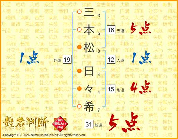 三(3画)本(5画)松(8画) 日(4画)々(4画)希(7画)