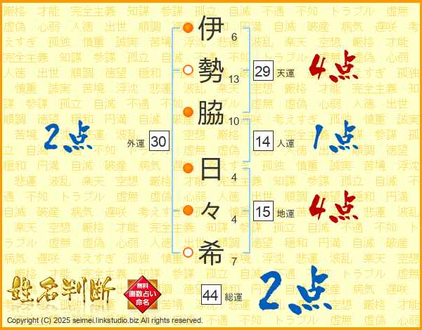 伊(6画)勢(13画)脇(10画) 日(4画)々(4画)希(7画)